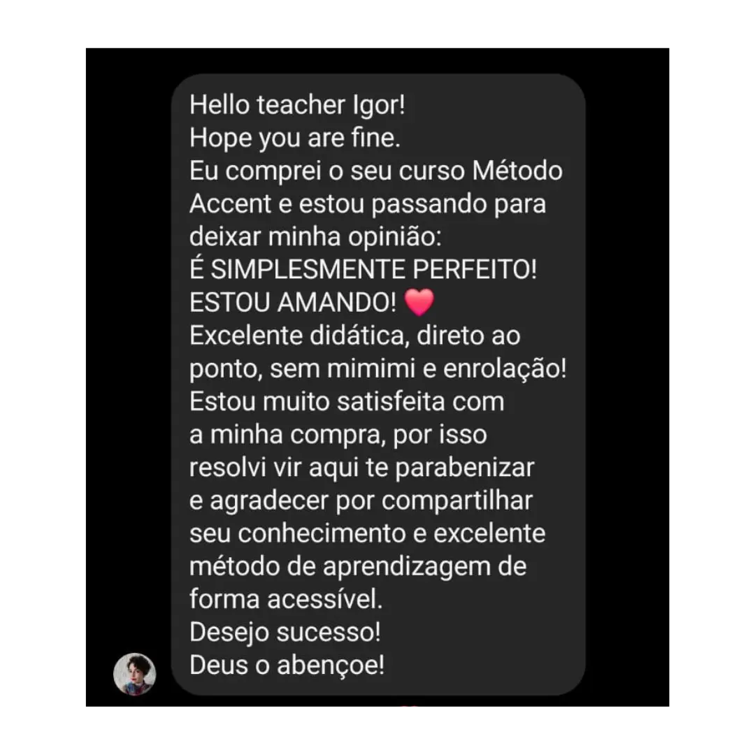 Hello there! Eu sou Igor Amaral, há quase 10 anos, tive acesso a diversas técnicas usadas por experts em pronúncia inglesa da Inglaterra, Bósnia, Estados Unidos e Escócia, que me ajudaram a criar um método que me permitiu evoluir no inglês como nunca imaginei, sem precisar ficar aprendendo toda aquela gramática complicada que os cursos tentam ensinar.